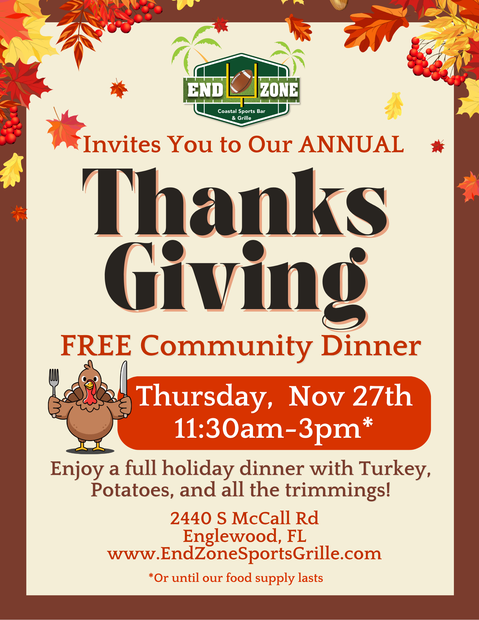 Located in Englewood, Fl. We are a local family owned and operated business with good food, cold beer and local musicians playing daily outside in our tiki hut and indoors for special events. Daily lunch and dinner specials. Happy Hour Monday -Friday 12-6pm. We are big enough to host your events, yet small enough to keep the hometown feel. We have inside dining or outside dining under the Tiki. We take reservations, Walk-Ins always Welcome, good for groups, good for kids, and we have take out and waiter service.
